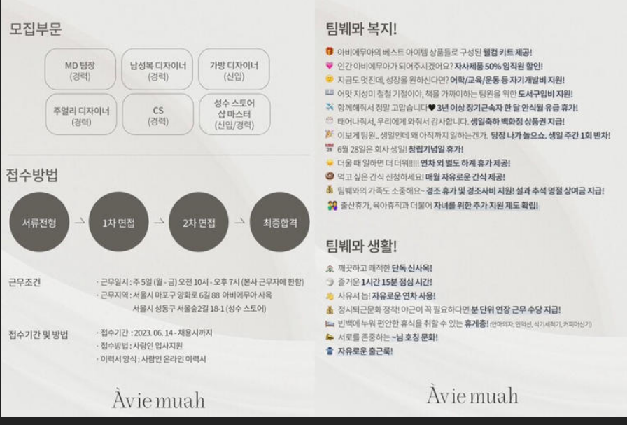 2023년, 아비에무아가 경력직 디자이너 채용 공고를 통해 연봉 2,500만 원을 제시하면서 ‘열정페이’ 논란이 일었습니다. 업계 기준에 한참 못 미치는 연봉이었던 탓에 여론은 빠르게 악화됐고, 브랜드 이미지에도 큰 타격을 입었죠.