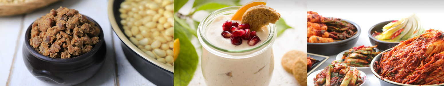 요거트, 김치, 청국장 등에는 **프로바이오틱스(유산균)**와 효소, 비타민 B군이 풍부하게 들어 있는데,