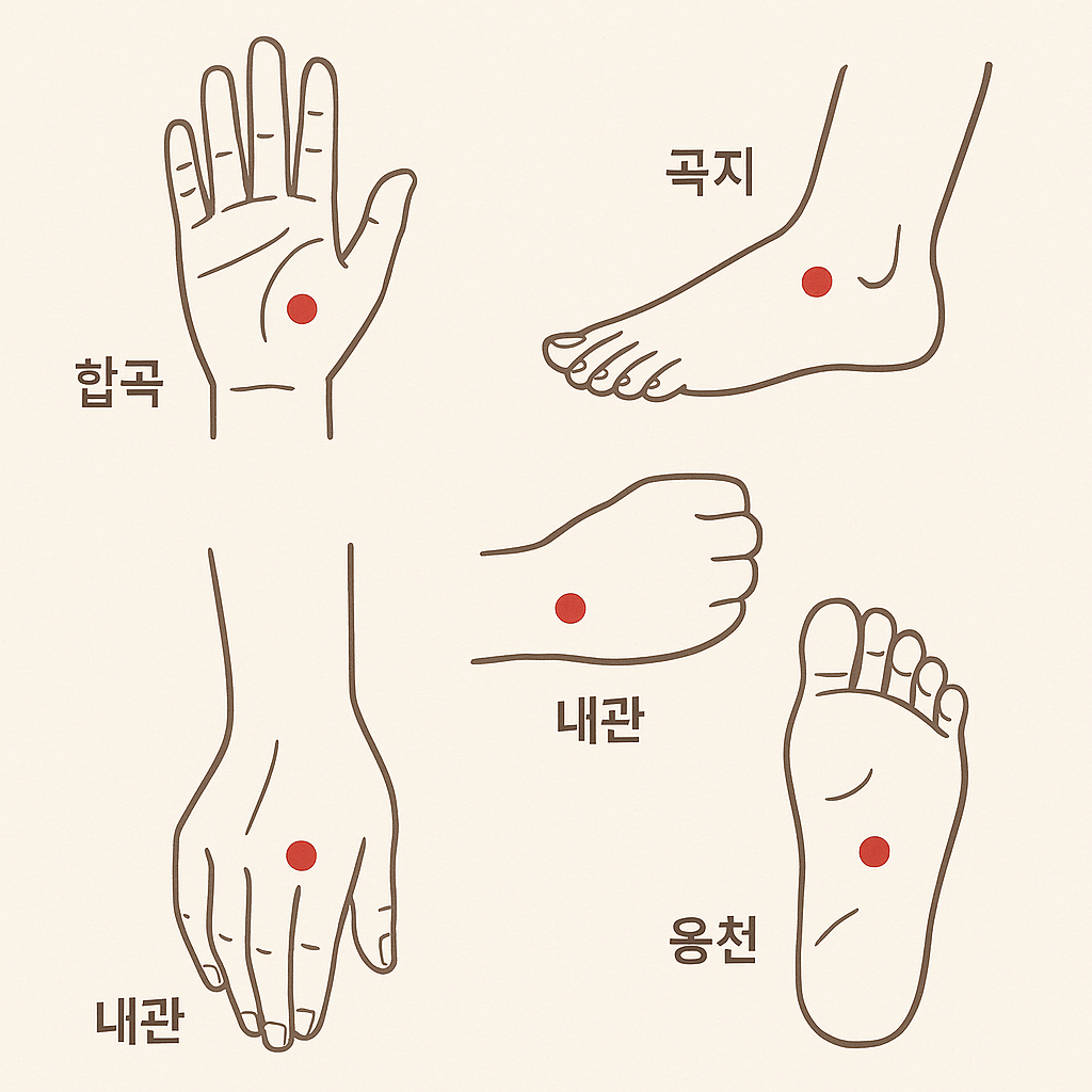 1. 합곡(合谷) – 얼굴 열감, 두통에 효과적