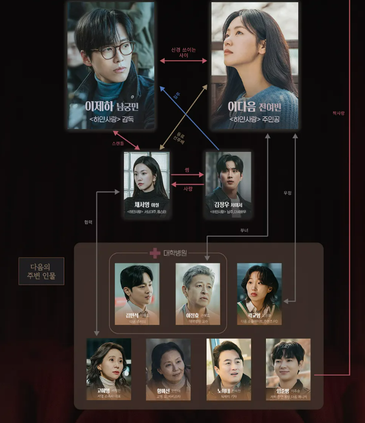| 이다음 | 남재인 (박은우) | 대학 동기. 재인은 다음의 복귀에 배신감을 느끼며 질투와 경쟁심 혼재 |