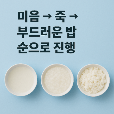 - 미음 → 죽 → 부드러운 밥 순으로 진행