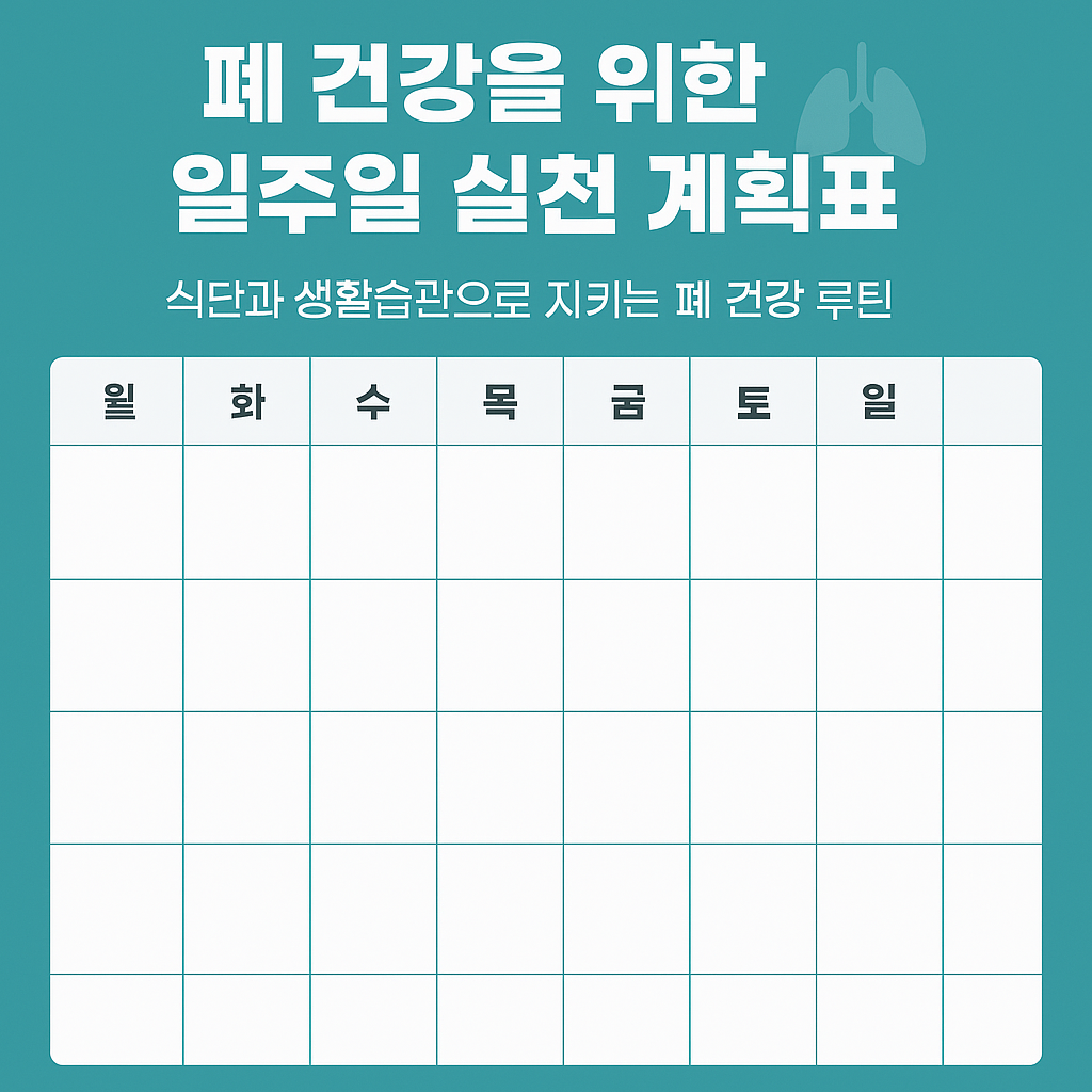 | 토요일 | 사과 + 도라지청 + 따뜻한 물 | 곡물밥 + 브로콜리볶음 + 무생채 | 감자조림 + 양배추쌈 + 마늘쌈장 | 녹차 1잔 + 블루베리 | 운동 후 도라지차 / 폐 스트레칭 / 1시간 걷기 |