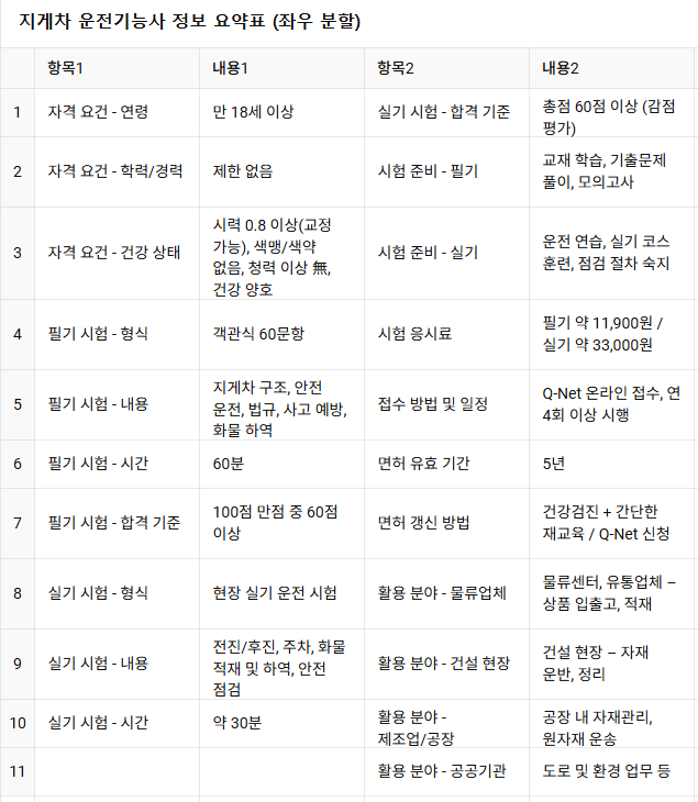9.아래표는 지게차 자격증의 모든 정보 요약 해 드렸어요. 바쁘신 분들 보시면 좋을 듯요.